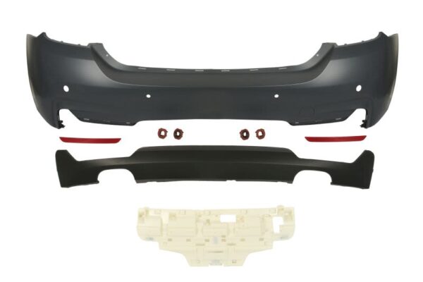 Zderzak (tył, M-PAKIET, kompletny, z otworami na parkomat, do malowania, wycięcie na rurę wydechową: dwie; podwójną) pasuje do: BMW 4 GRAN COUPE F36 02.14-02.17